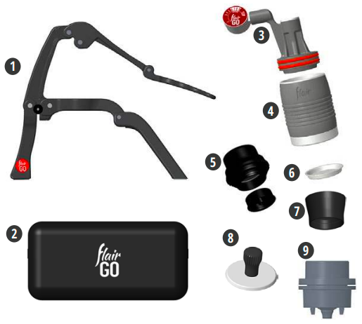 Περιλαμβάνεται σε όλα τα Flair 2GOs 1. Πτυσσόμενο Flair 2GO Σώμα 2. Flair 2GO Θήκη μεταφοράς 3. Έμβολο με μανόμετρο 4. Κύλινδρος παρασκευής χωρίς προθέρμανση Περιλαμβάνεται στο μοντέλο Grounds 5. Φίλτρο 2 σε 1 χωρίς πάτο 6. Stainless steel dispersion screen ( βρίσκεται μέσα στον κύλινδρο παρασκευής ) 7. Χωνί δοσολογίας 8. Flair 2GO Παραβίαση Περιλαμβάνεται με το μοντέλο Pods 9. Φίλτρο Pod |  |