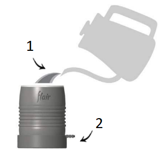 Το Flair 2GO σας δεν απαιτεί προθέρμανση για να μια καλή εκχύλιση εσπρέσο. Αλλά, αν κάνετε παρασκευή με ελαφρύ καβούρδισμα ή θέλετε μια επιπλέον καυτή δόση, μπορείτε να προθερμάνετε τον κύλινδρο. Υπάρχουν δύο μέθοδοι που προτείνουμε. - Τοποθετήστε τον κύλινδρο σας σε όρθια θέση σε ένα μπολ ή νεροχύτη και γεμίστε τον με βραστό νερό. Αφήστε τον να καθίσει για 30 δευτερόλεπτα. Αφαιρέστε τον προσεκτικά.
