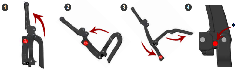 3. Χαμηλώστε την πίσω κολόνα και τα πόδια - Χαμηλώστε την πίσω κολόνα, με το λογότυπο, με το αριστερό σας χέρι. Η μαύρη κυκλική κλειδαριά κουμπώνει στη θέση της. Χαμηλώστε τα πόδια.