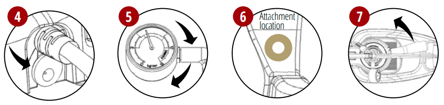 7. Εισάγετε το Portafilter με τη λαβή ακριβώς δεξιά από τον χαμηλωμένο μοχλό. Γυρίστε το αριστερόστροφα για να ασφαλίσει (περίπου στις 4 η ώρα).